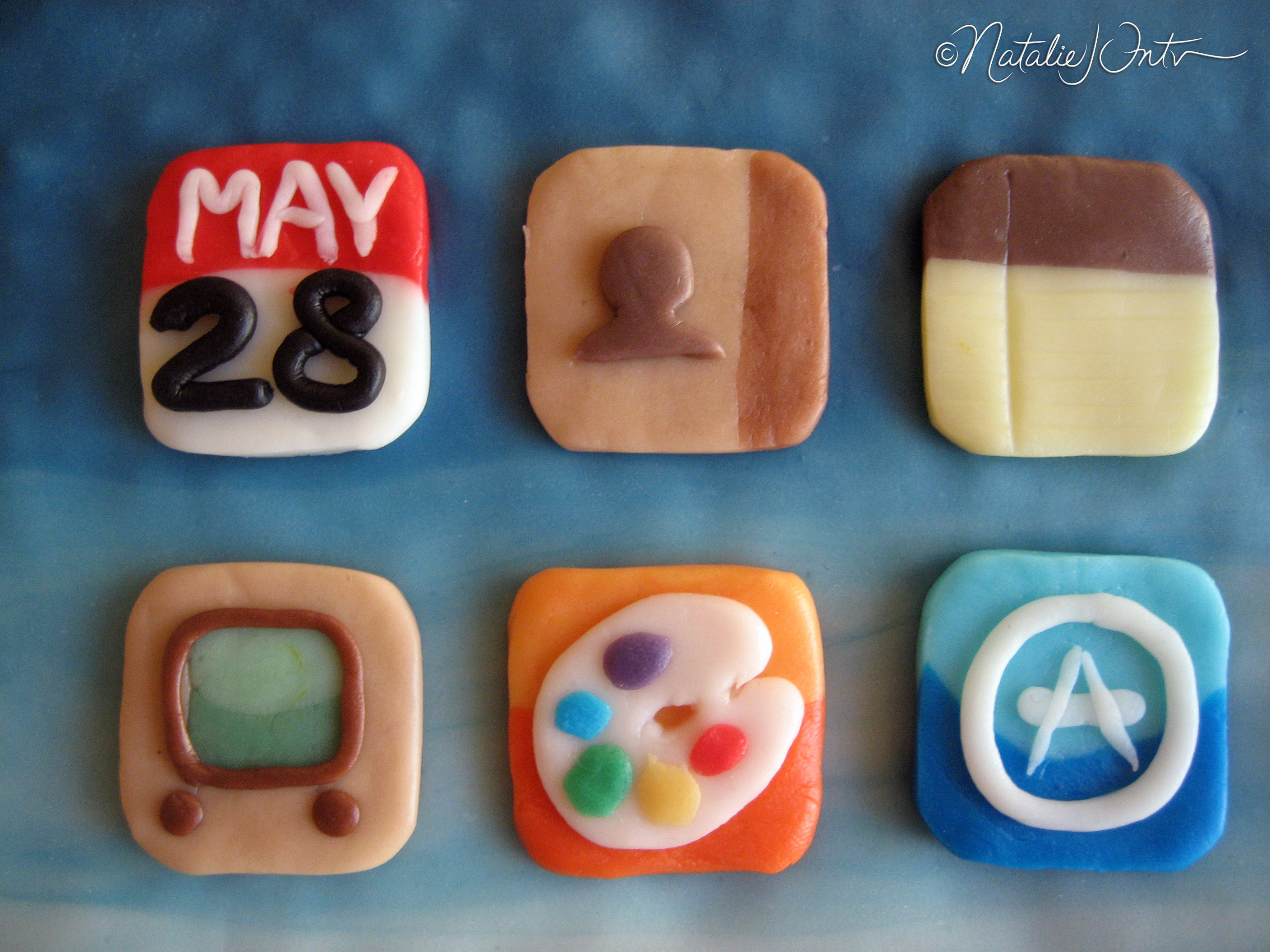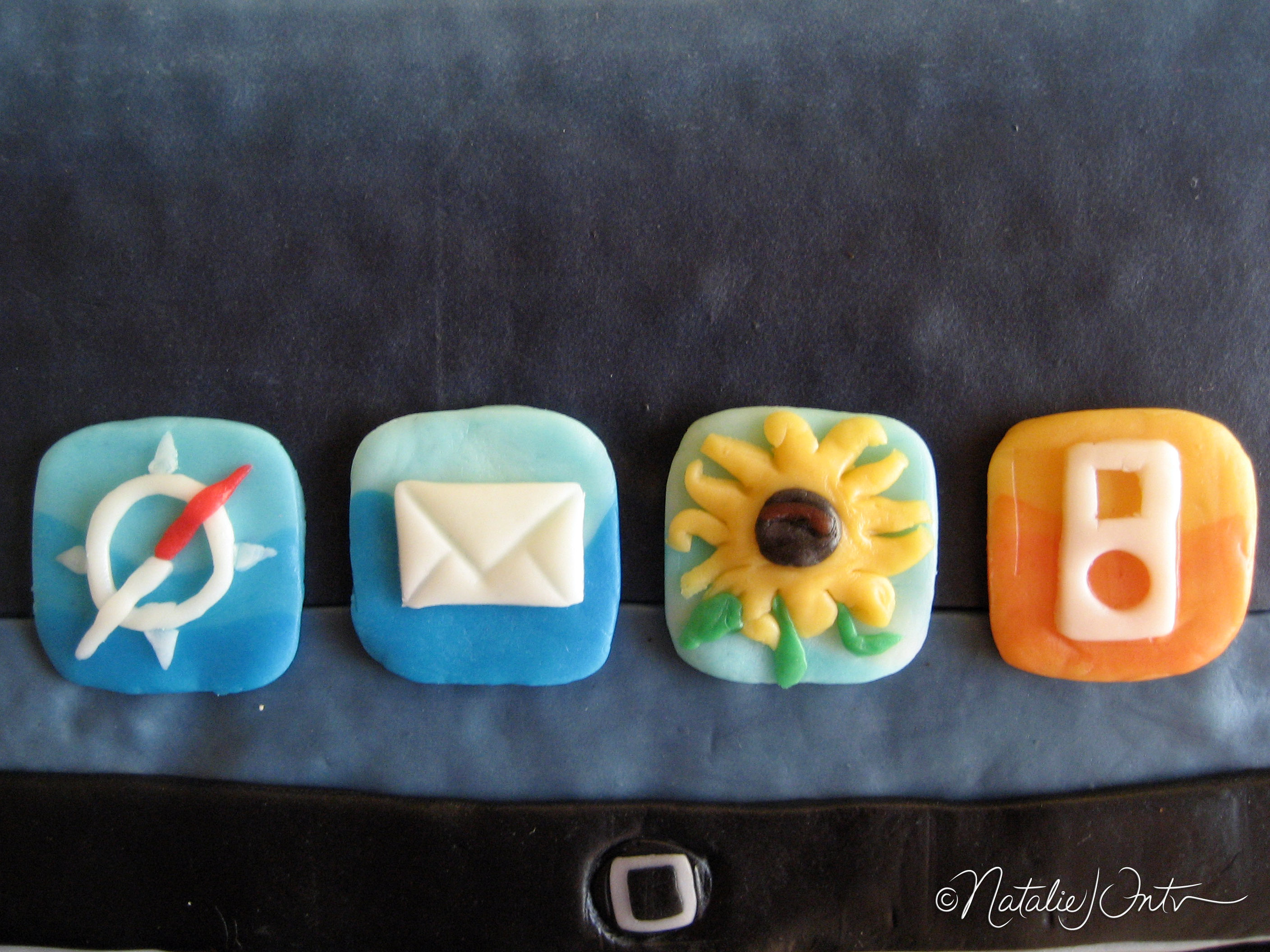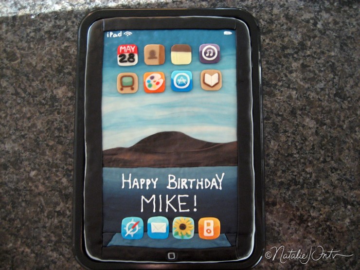 My first foray with fondant!!! I made this cake the month that the iPad was released, for a birthday of a loyal Apple user and fan (like myself). I first made a rough sketch of the design, and baked a rectangular cake. I used pre-made Wilton fondant, and coloured portions with food colour. I created the sky streaking, mountain marbling, and water gradient by laying out strips of the various colours in the general orientation that I needed, and then kneaded them just enough to stick and blend together. I rolled them out with a rolling pin, cut out the shapes where they intersect, draped them over the cake, and trimmed the edges. I used an exacto knife to cut out individual shapes for the app icons, and fused them together by lightly painting the connecting portions with water. I didn’t use any buttercream icing between the cake and the fondant, so after a while it settled into the cake texture. Lesson learned: Always ‘dirty ice’ the cake with a layer of buttercream under the fondant to get a smooth finish. Overall, the fondant was great to work with, and opened up a whole new world of cake decorating possibilities!