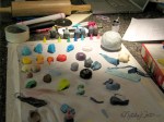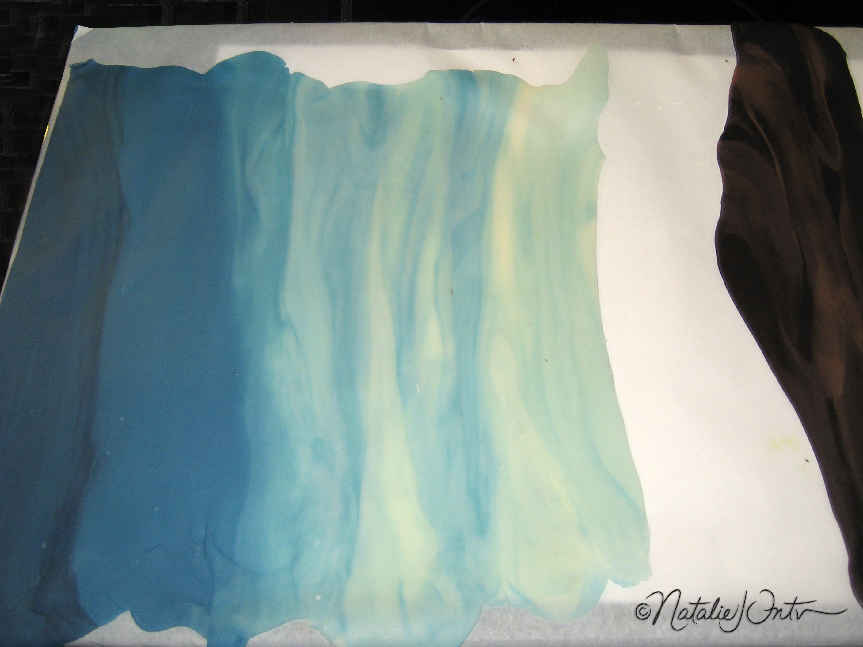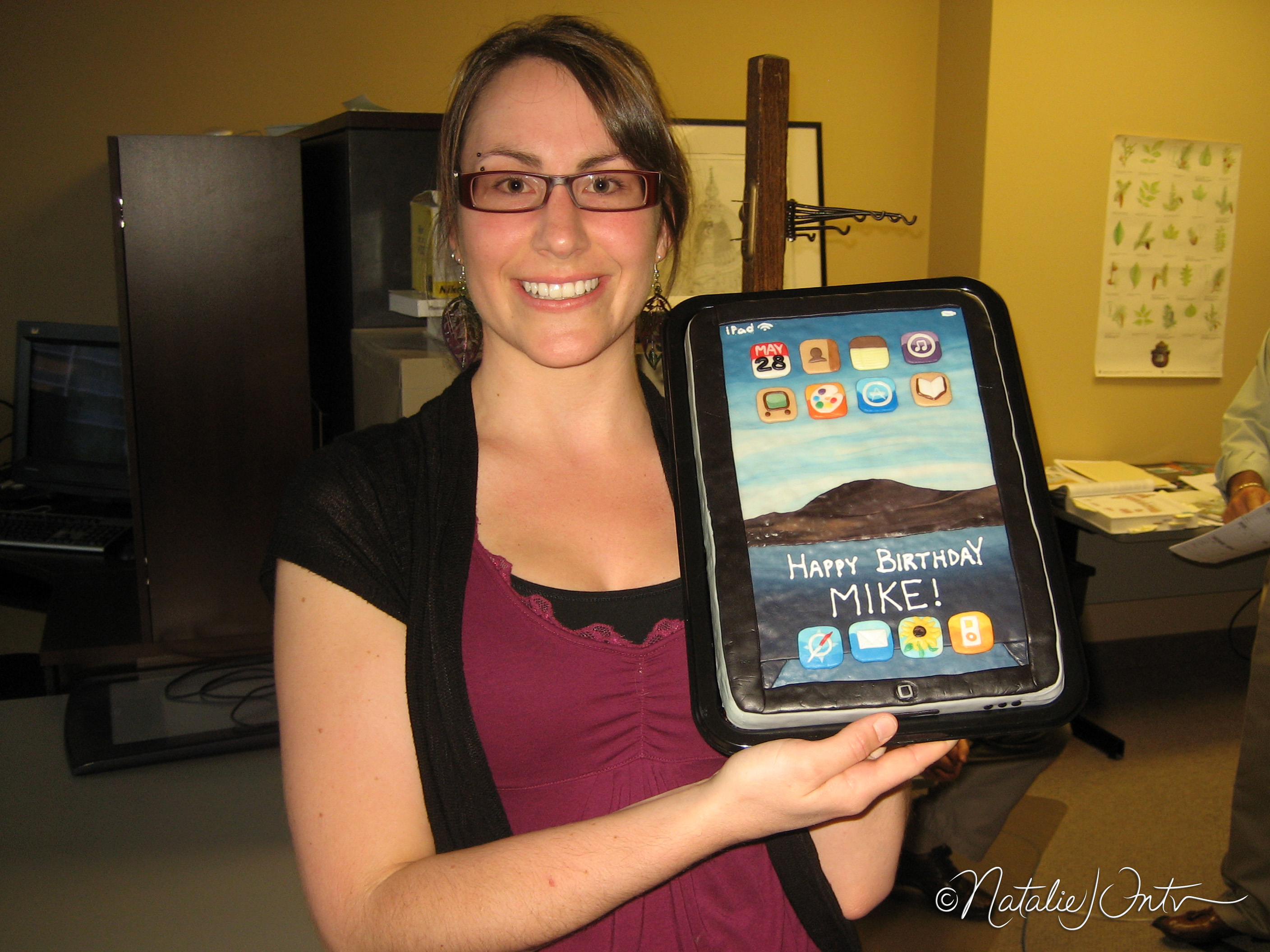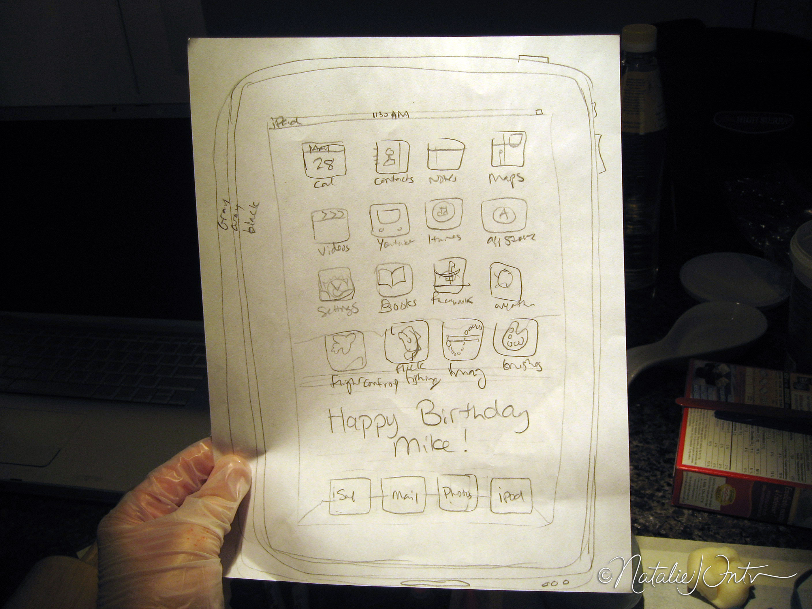 My first foray with fondant!!! I made this cake the month that the iPad was released, for a birthday of a loyal Apple user and fan (like myself). I first made a rough sketch of the design, and baked a rectangular cake. I used pre-made Wilton fondant, and coloured portions with food colour. I created the sky streaking, mountain marbling, and water gradient by laying out strips of the various colours in the general orientation that I needed, and then kneaded them just enough to stick and blend together. I rolled them out with a rolling pin, cut out the shapes where they intersect, draped them over the cake, and trimmed the edges. I used an exacto knife to cut out individual shapes for the app icons, and fused them together by lightly painting the connecting portions with water. I didn’t use any buttercream icing between the cake and the fondant, so after a while it settled into the cake texture. Lesson learned: Always ‘dirty ice’ the cake with a layer of buttercream under the fondant to get a smooth finish. Overall, the fondant was great to work with, and opened up a whole new world of cake decorating possibilities!