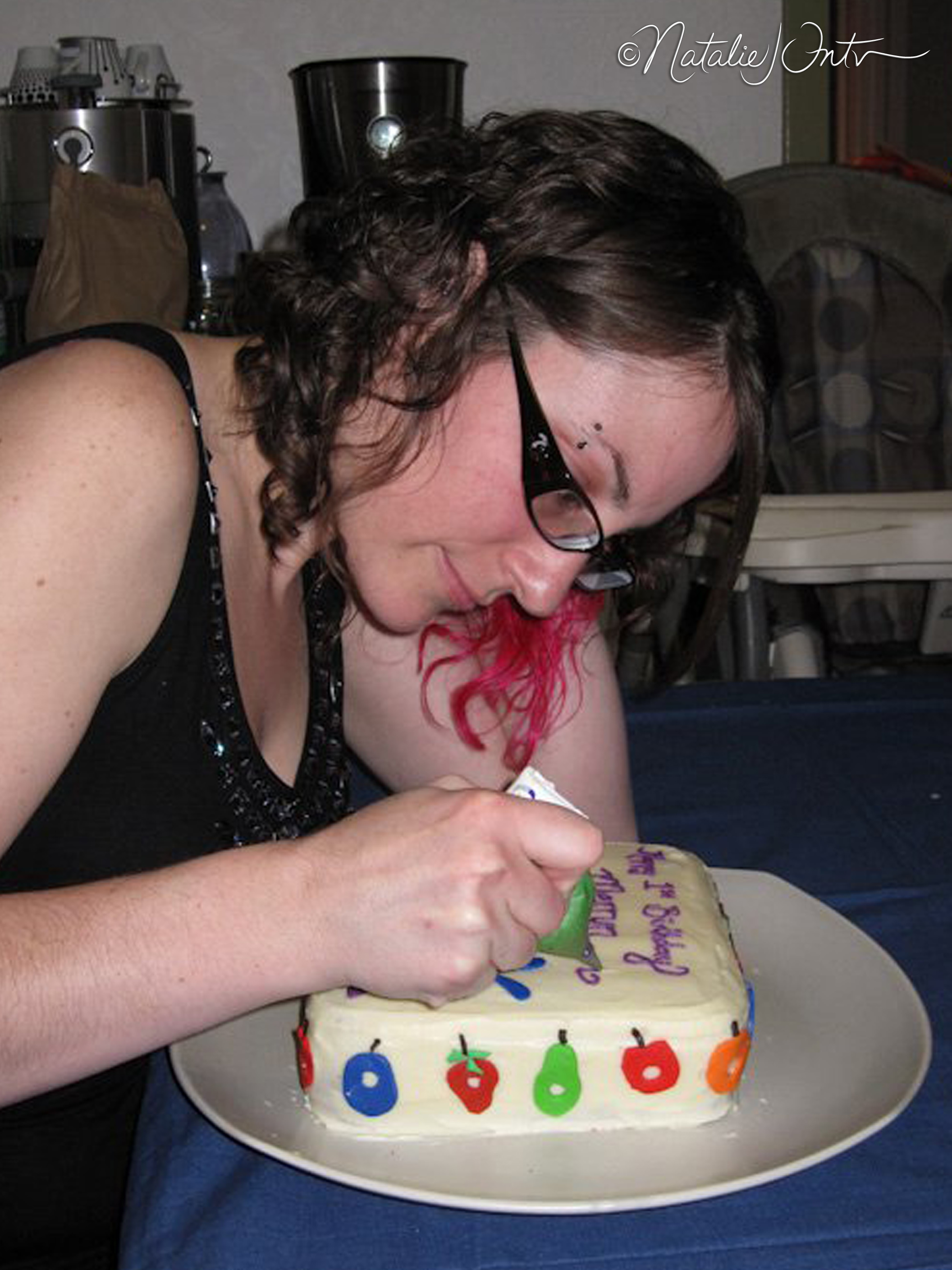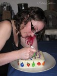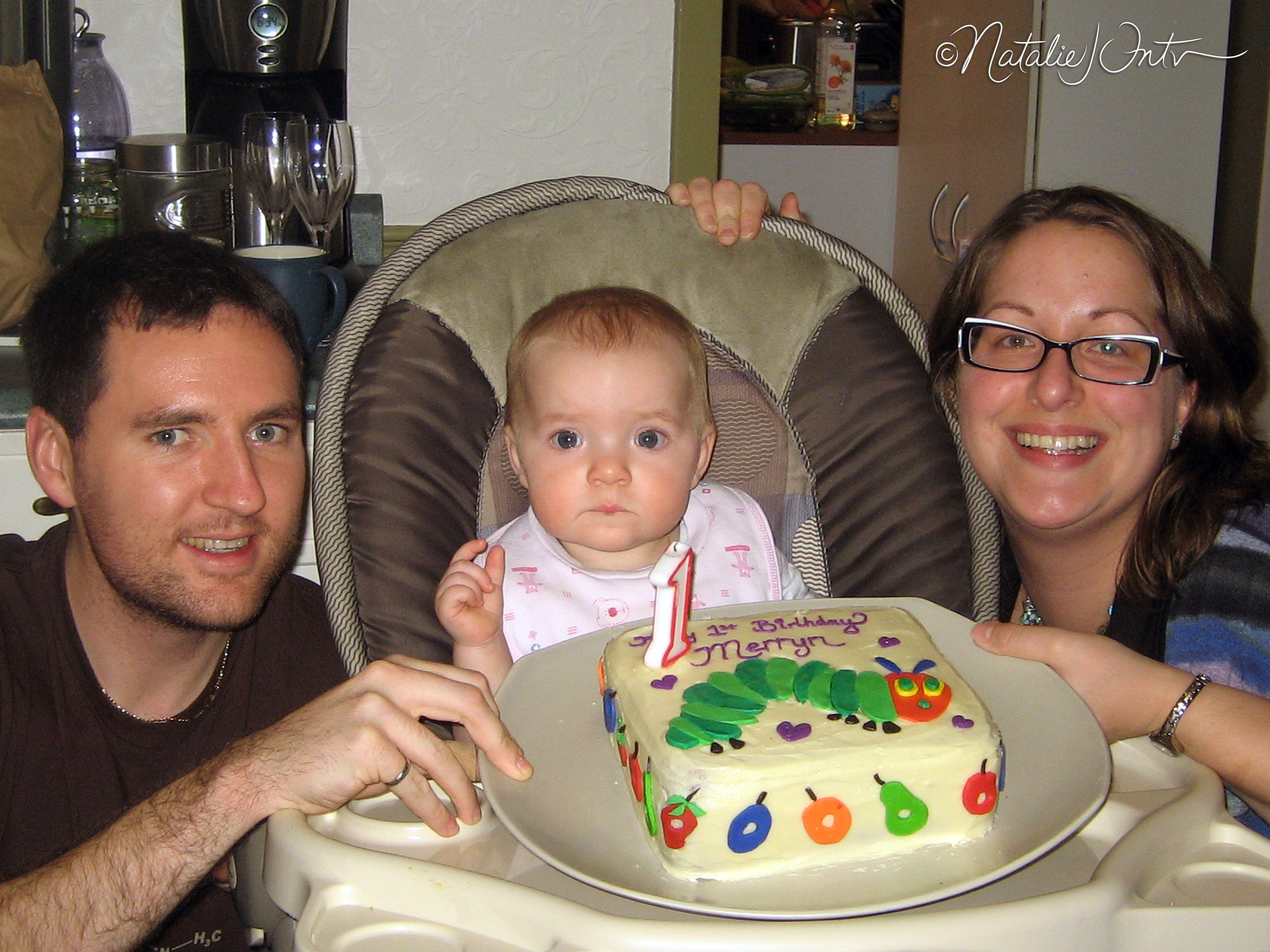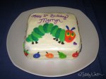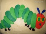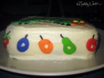 This was a 1st birthday cake for my delightful niece, Merryn! The design was inspired by the children’s book The Very Hungry Caterpillar by Eric Carle. I made a carrot cake from scratch and covered it with cream cheese icing. I colored, rolled, cut, and added the fondant shapes for the caterpillar and fruit. 🙂