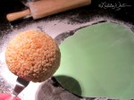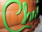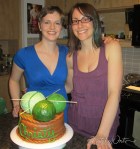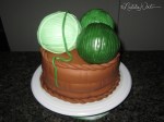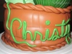 This birthday cake features yarn in a basket, made for my friend who has become quite the talented knitter! The yarn balls are made using rounded rice krispy treats, covered in a layer of solid fondant, and then small fondant strips. If I had all the time in the world I would have loved to roll each piece of yarn into a round string… but to save time on this one I ended up using a ribbon cutter to create the small strips, kept them bunched together, and attached panels of a few strips at a time. These sit on a base of spice cake covered in brown fondant with a subtle basket weave pattern imprinted. I finished it off with some BBQ skewers as knitting needles, and a hand-shaped yarn name for the birthday girl.