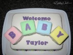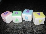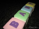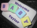 This cake was made to celebrate the birth of a coworker’s baby. I made the baby blocks using rice krispy treats. I used a square muffin pan to form the basic shape, and let them cool in the pan. I covered them with buttercream, white fondant, and then various colored fondant squares and letters. Next time to get a smoother finish on the block faces, I would try trimming the sides from the blocks with a knife once they were chilled. I cut out the fondant letters by hand using printed paper cutouts as a template.