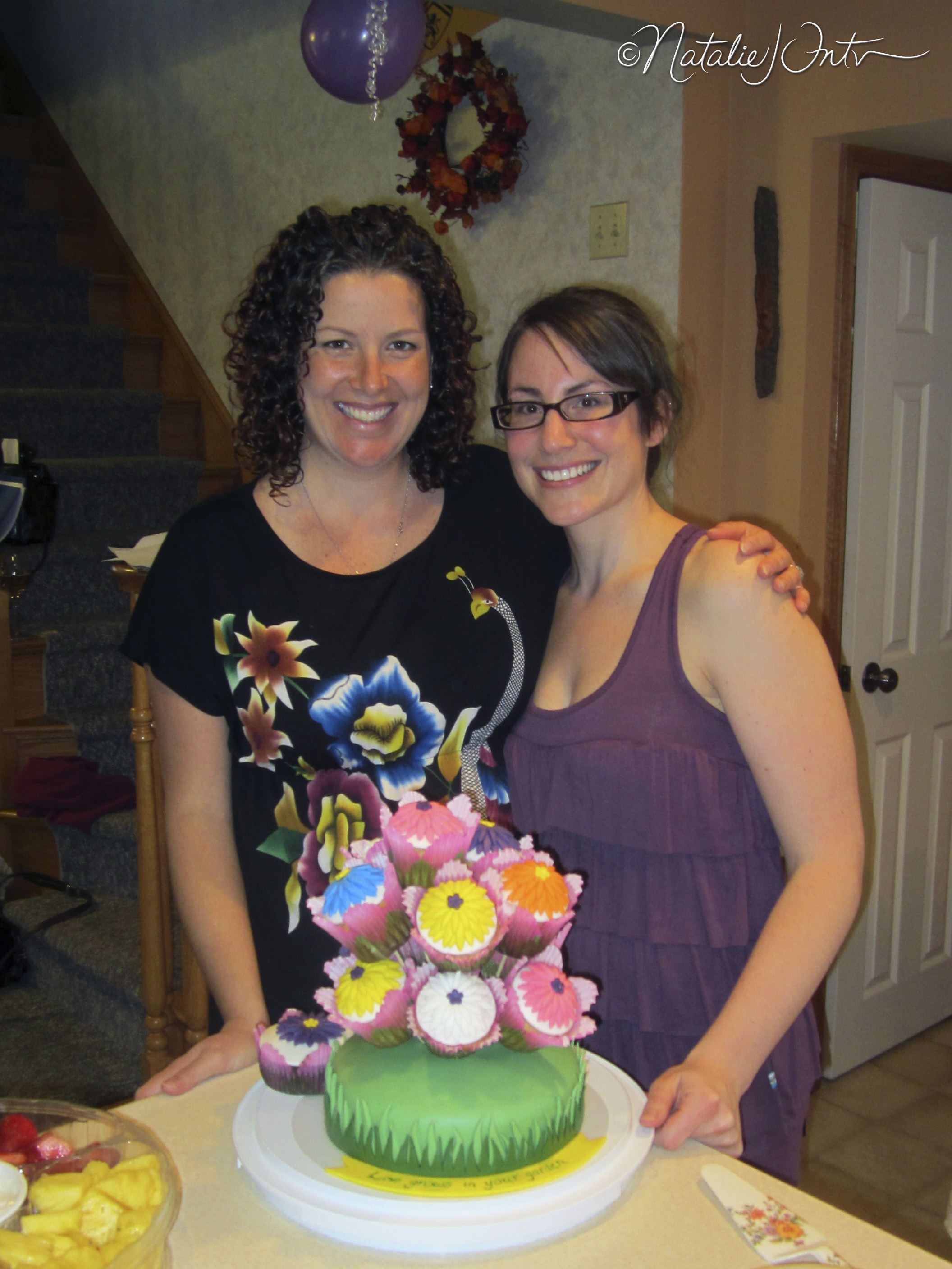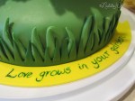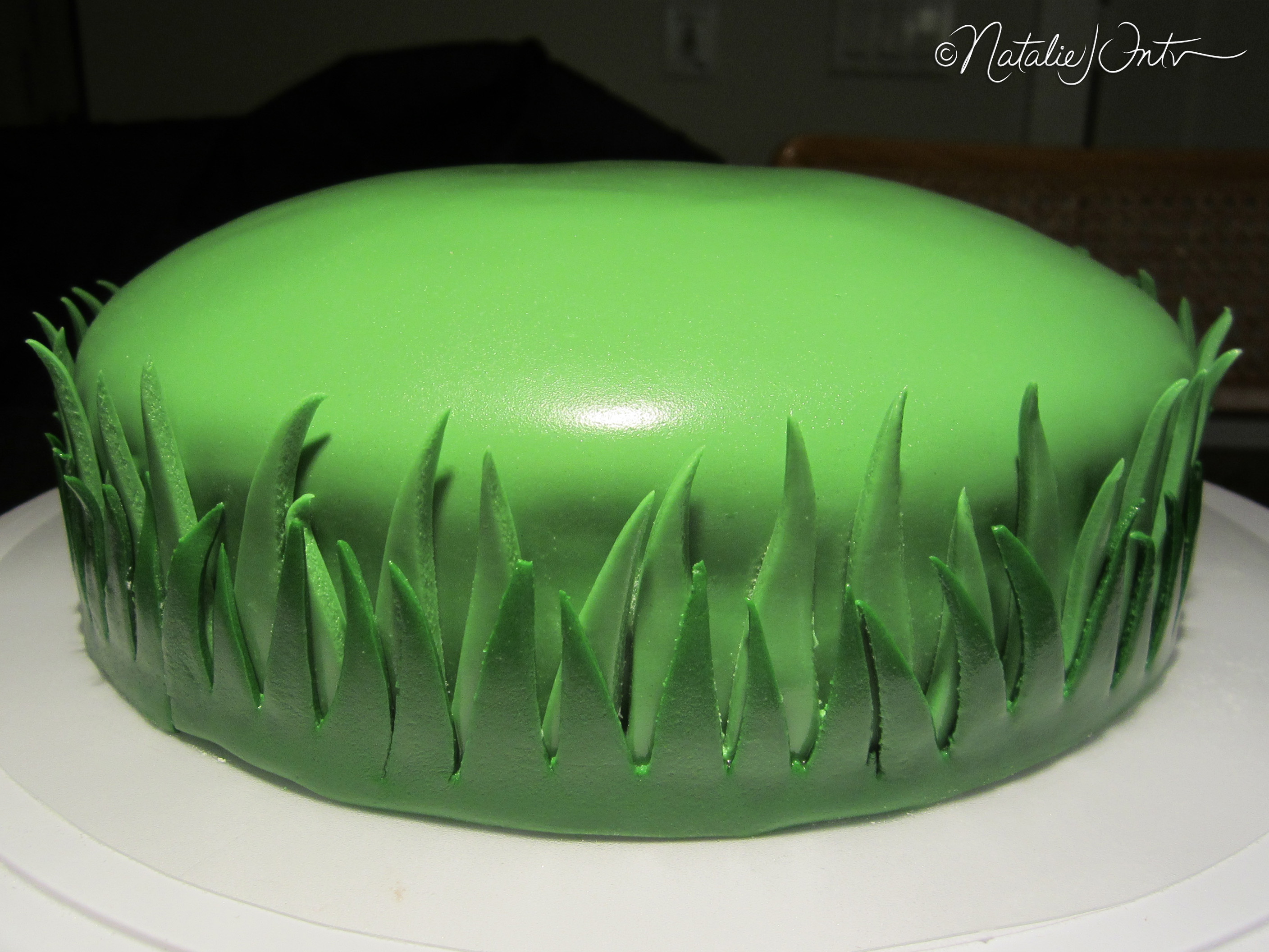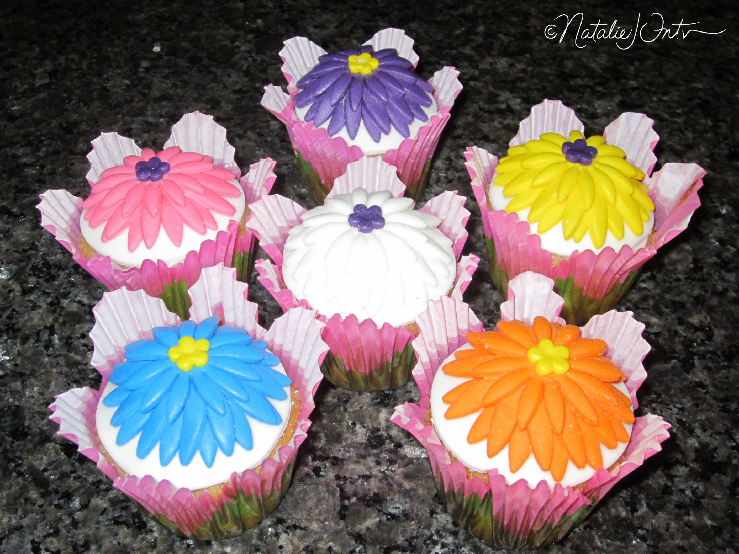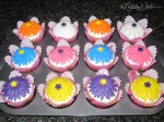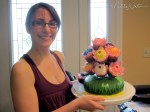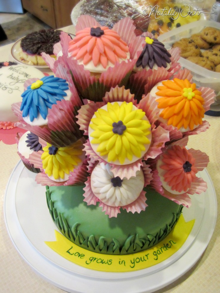 Sweet springtime flowers to celebrate new life! This was a cupcake bouquet for my cousin’s baby shower celebration, inspired by her love for life, nature, and colour! I baked the cupcakes in paper flower petal wrappers, and decorated them with fondant flowers made using Wilton’s Gum Paste Flower Cutter Set. I wanted to have the flower cupcakes ‘growing’ out of a base of green grass. The weight of the cupcakes would be too great for the cake alone to support, so I filled a plastic cup with leftover fondant, and set it inside the cake base before I covered it with green fondant and added layers of green grass around the base. I cut BBQ skewers at different lengths for the flower stems, speared them through the cupcakes, and then stuck them into the fondant inside the green base cake to create the bouquet.